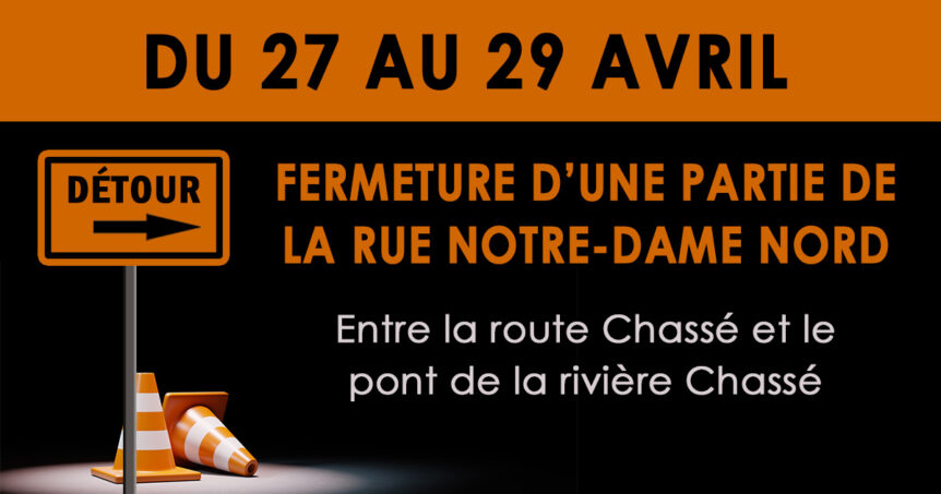 Ces travaux entraîneront la fermeture de la rue Notre-Dame Nord, entre la route Chassé et le pont de la rivière Chassé, du 27 au 29 avril 2026.