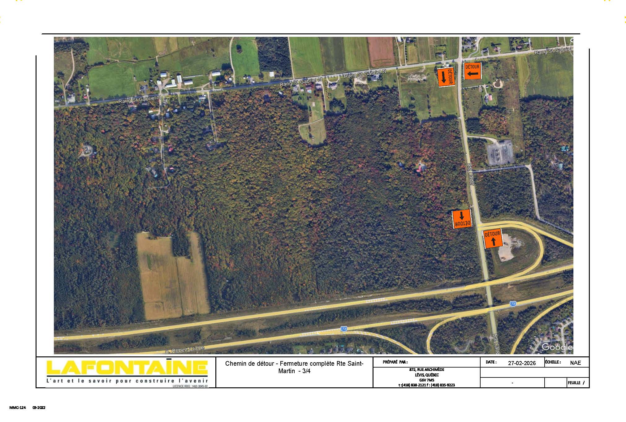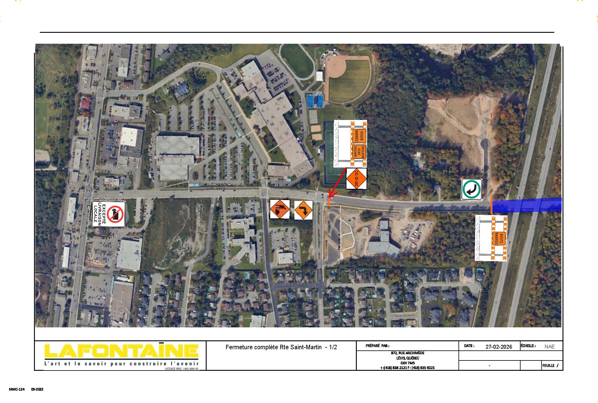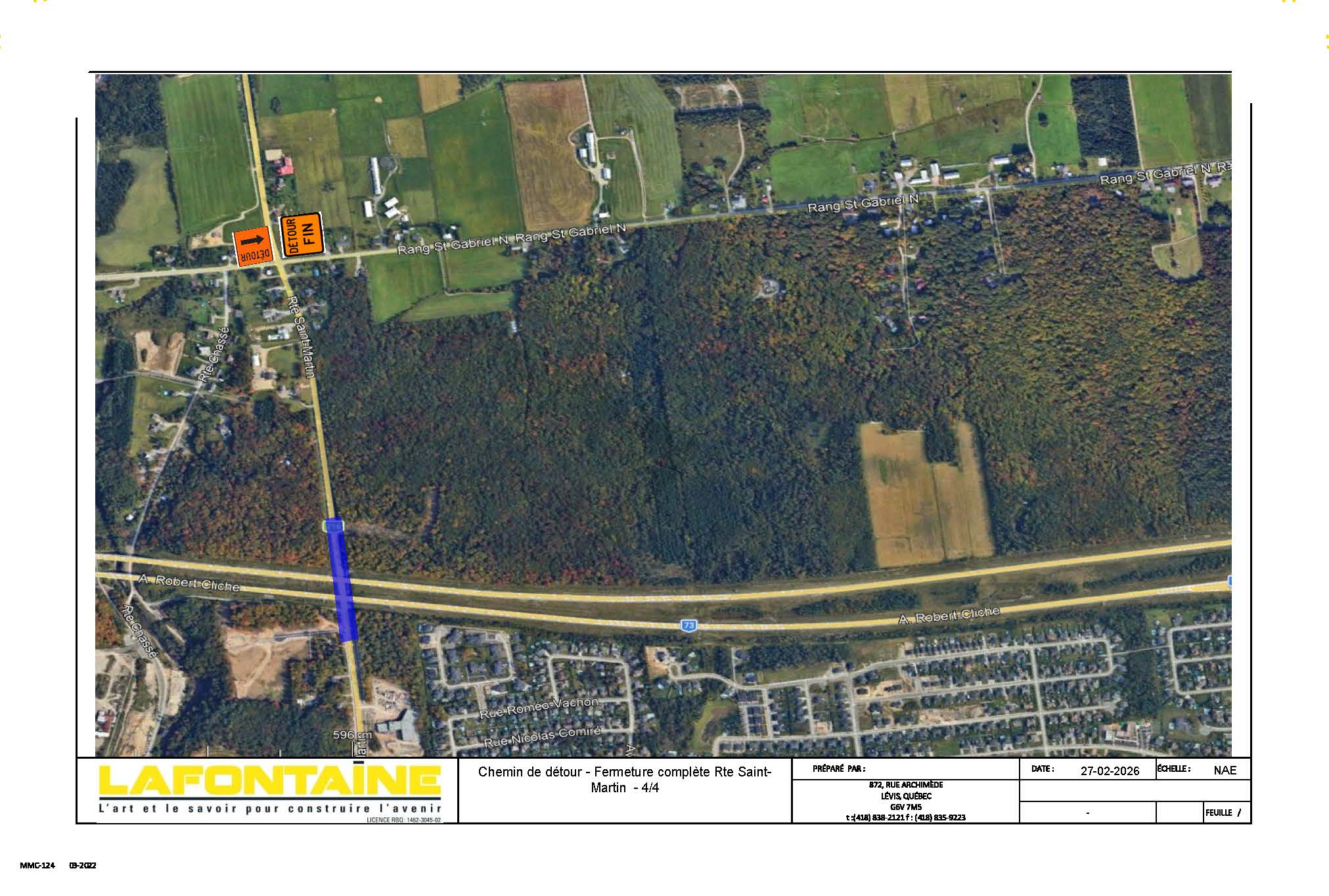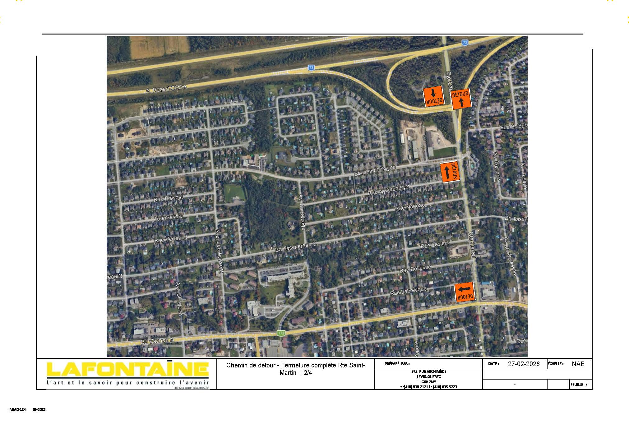 Ces travaux nécessiteront la fermeture complète d’un tronçon de la route Saint-Martin, soit entre le boulevard Lamontagne et le rang Saint-Gabriel Nord. Pour la portion entre le boulevard Lamontagne et le viaduc de l’autoroute 73, l’accès aux résidences, à l’école primaire Maribel ainsi qu’aux ensembles immobiliers « Sentiers 59 » et « Les boisés de la Cité », sera possible via le boulevard Vachon Nord, tandis que l’autre portion sera accessible par le biais du rang Saint-Gabriel Nord.