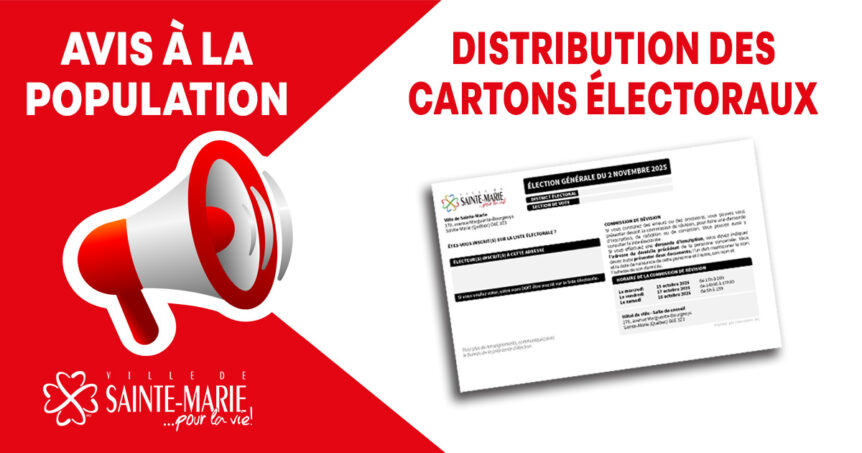 Sainte-Marie, le 9 octobre 2025. – En prévision des élections municipales du 2 novembre prochain et compte tenu de la grève en cours du personnel de Postes Canada, la Ville de Sainte-Marie informe la population que la distribution des cartons électoraux se fera directement aux portes des résidences. Au cours des prochains jours, des représentants dûment autorisés par la Ville …